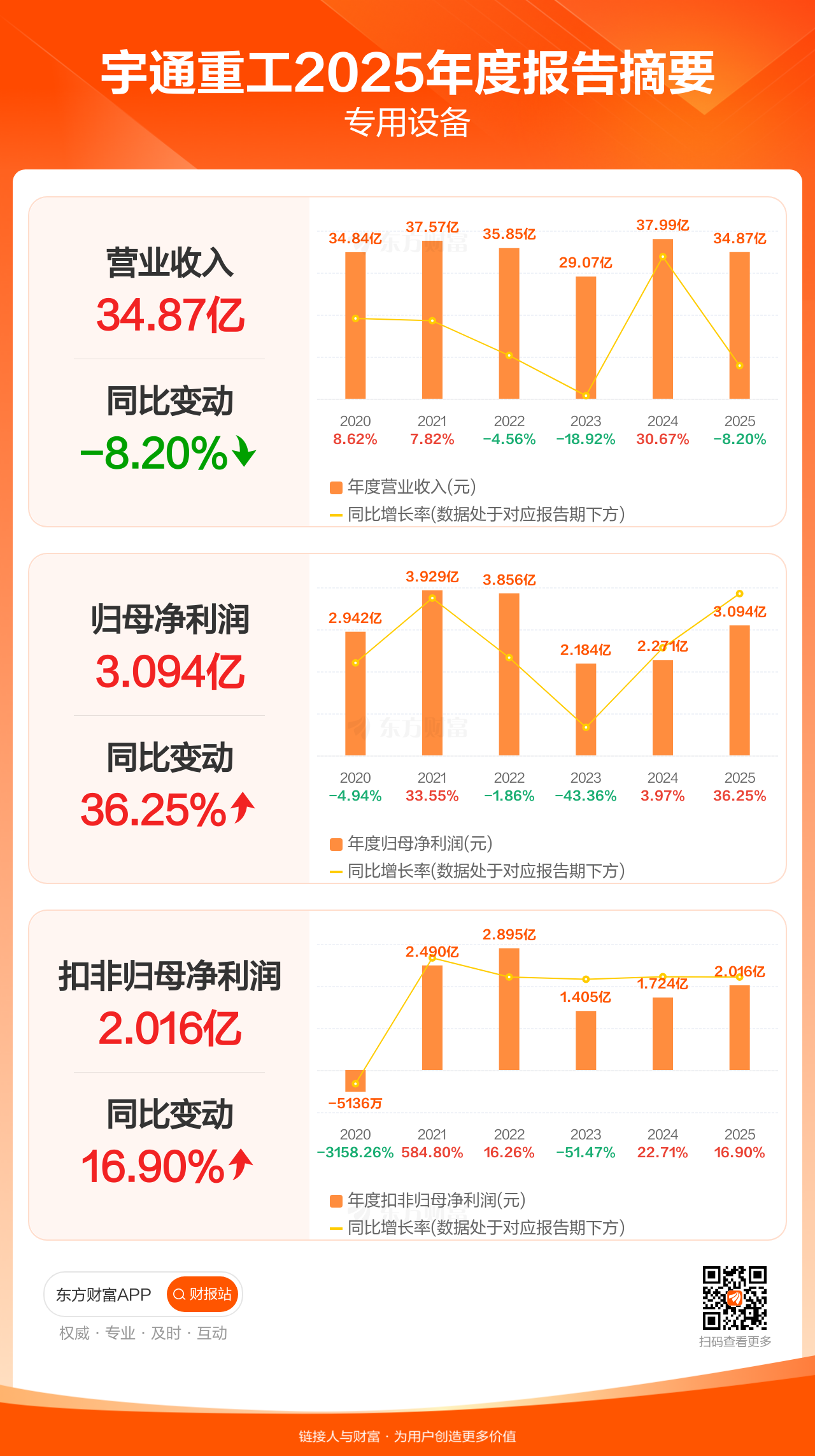 宇通重工4月3日发布2025年年报显示,公司全年实现营业收入34.87亿元,同比下滑8.20%;归母净利润3.09亿元,同比增长36.25%;扣非归母净利润2.02亿元,同比增长16.90%。