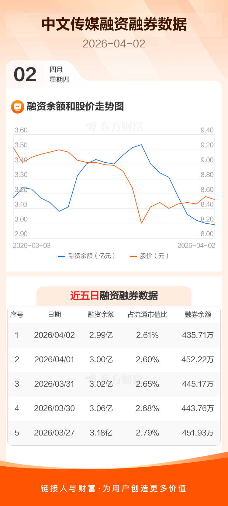 交易所最新数据显示,中文传媒于2026年4月2日获融资买入558.37万元,融资偿还575.71万元,当日融资净偿还17.34万元。目前,该股融资余额2.99亿,占流通市值比例为2.61%。