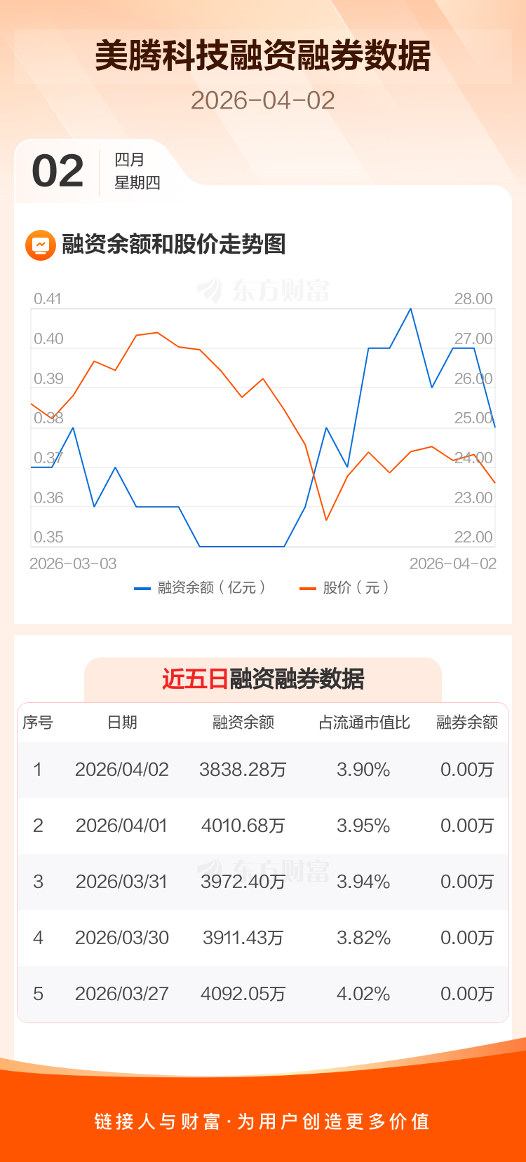 交易所最新数据显示,美腾科技于2026年4月2日获融资买入147.21万元,融资偿还319.61万元,当日融资净偿还172.4万元。目前,该股融资余额3838.28万,占流通市值比例为3.90%。