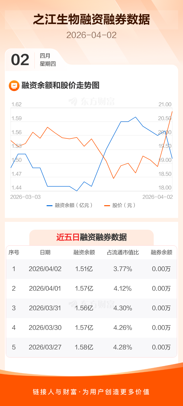 交易所最新数据显示,之江生物于2026年4月2日获融资买入1511.21万元,融资偿还2078.53万元,当日融资净偿还567.32万元。目前,该股融资余额1.51亿,占流通市值比例为3.77%。