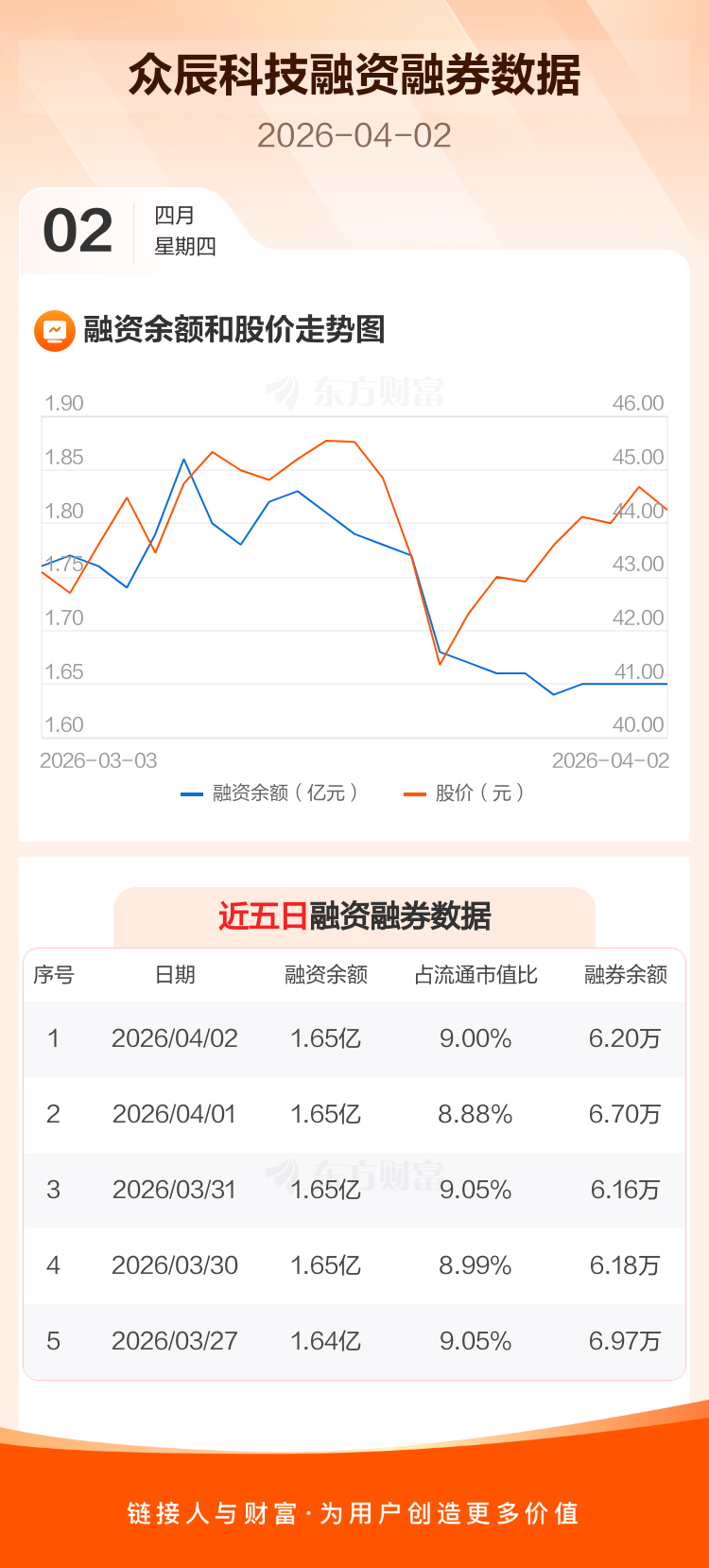交易所最新数据显示,众辰科技于2026年4月2日获融资买入395.08万元,融资偿还340.99万元,当日融资净买入54.09万元。目前,该股融资余额1.65亿,占流通市值比例为9.00%。