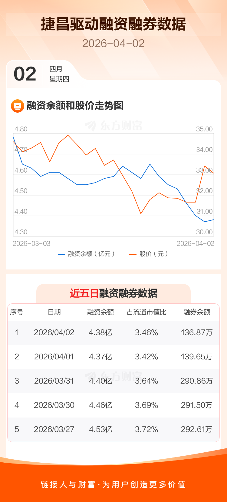 交易所最新数据显示,捷昌驱动于2026年4月2日获融资买入1571.43万元,融资偿还1504.65万元,当日融资净买入66.78万元。目前,该股融资余额4.38亿,占流通市值比例为3.46%。
