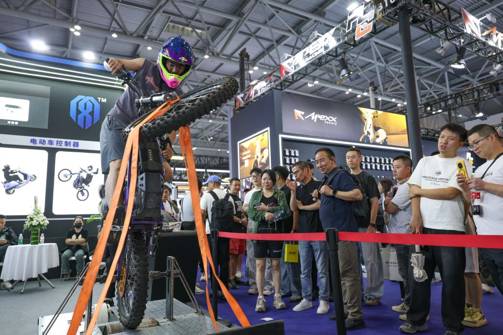 2025年9月,观众在重庆摩博会现场体验国产新能源摩托车控制器自动翘头功能。新华社记者陈诚摄