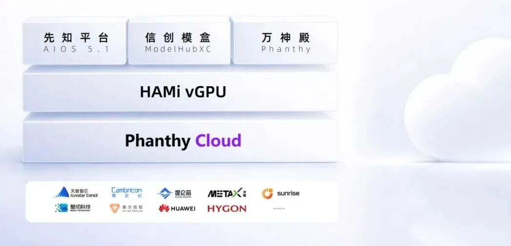 简单来说,它在老本行先知AI平台的基础上,融合三个新产品(ModelHub XC、HAMi vGPU、PhanthyCloud),实现端到端、全栈式的矩阵,多以软硬一体机等形式交付。