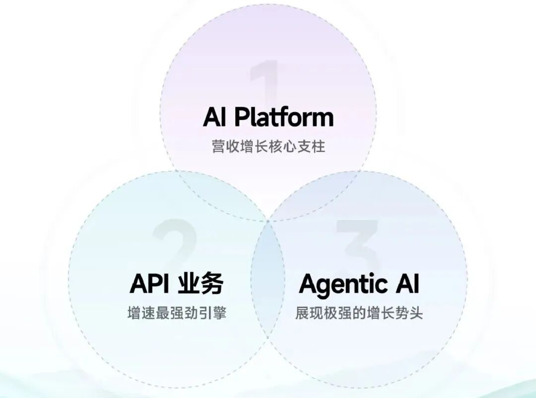 新确立的三大主业,均有较高的AI浓度——主打PaaS的AI Platform、基于Token逻辑的API业务、按结果付费的Agentic AI业务,且各有侧重、相互赋能。