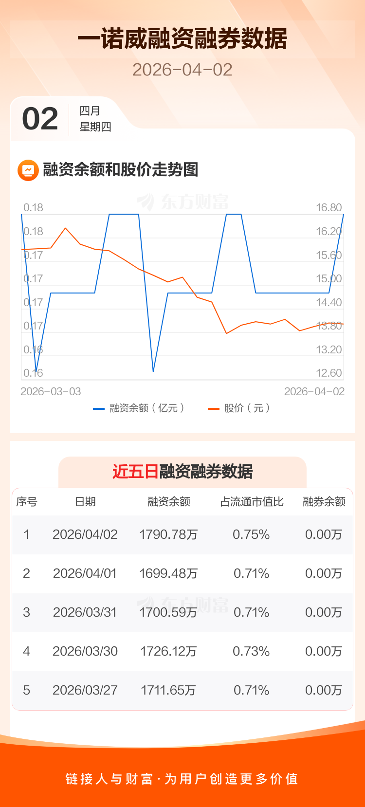 交易所最新数据显示,一诺威于2026年4月2日获融资买入110.61万元,融资偿还19.32万元,当日融资净买入91.29万元。目前,该股融资余额1790.78万,占流通市值比例为0.75%。