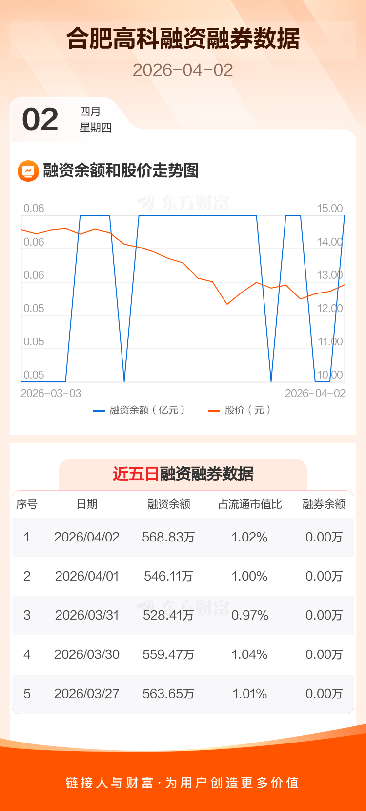 交易所最新数据显示,合肥高科于2026年4月2日获融资买入49.99万元,融资偿还27.26万元,当日融资净买入22.72万元。目前,该股融资余额568.83万,占流通市值比例为1.02%。