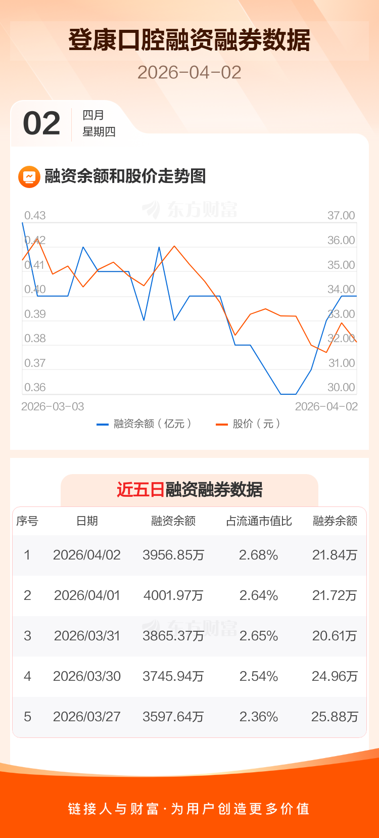 交易所最新数据显示,登康口腔于2026年4月2日获融资买入760.70万元,融资偿还805.82万元,当日融资净偿还45.12万元。目前,该股融资余额3956.85万,占流通市值比例为2.68%。