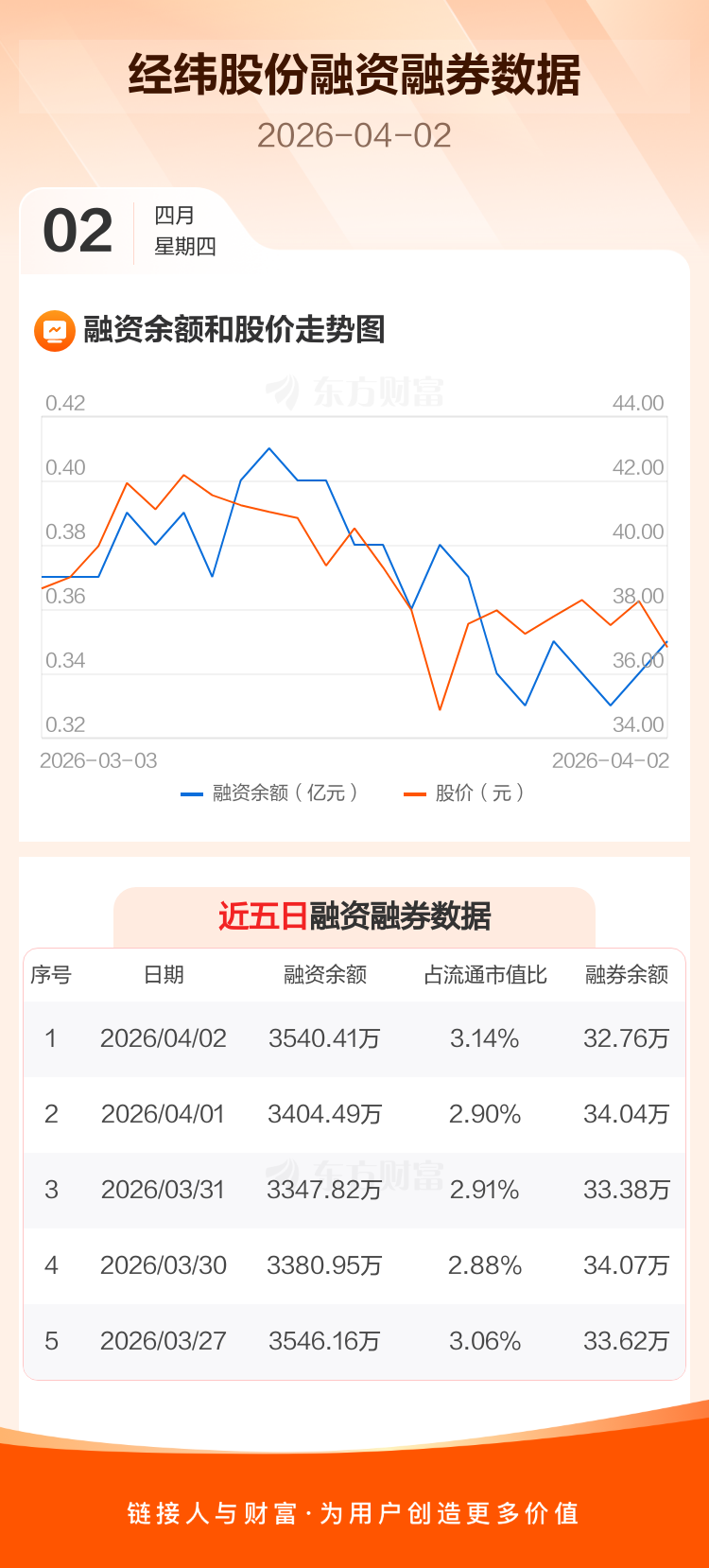 交易所最新数据显示,经纬股份于2026年4月2日获融资买入432.15万元,融资偿还296.23万元,当日融资净买入135.92万元。目前,该股融资余额3540.41万,占流通市值比例为3.14%。