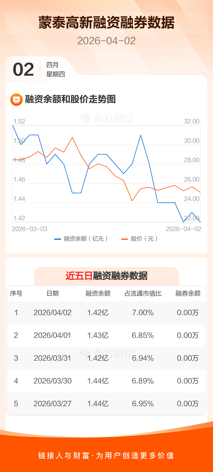 交易所最新数据显示,蒙泰高新于2026年4月2日获融资买入377.91万元,融资偿还410.65万元,当日融资净偿还32.73万元。目前,该股融资余额1.42亿,占流通市值比例为7.00%。