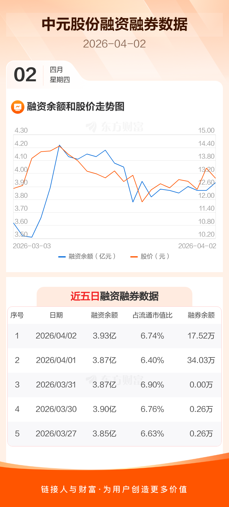 交易所最新数据显示,中元股份于2026年4月2日获融资买入3575.60万元,融资偿还2963.64万元,当日融资净买入611.96万元。目前,该股融资余额3.93亿,占流通市值比例为6.74%。