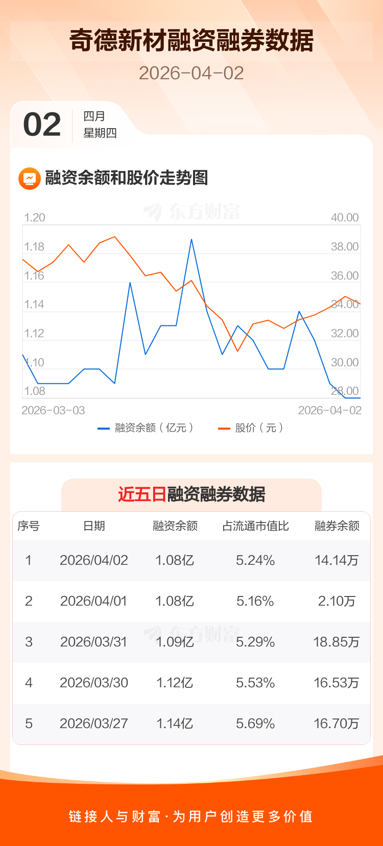 交易所最新数据显示,奇德新材于2026年4月2日获融资买入652.21万元,融资偿还653.41万元,当日融资净偿还1.21万元。目前,该股融资余额1.08亿,占流通市值比例为5.24%。