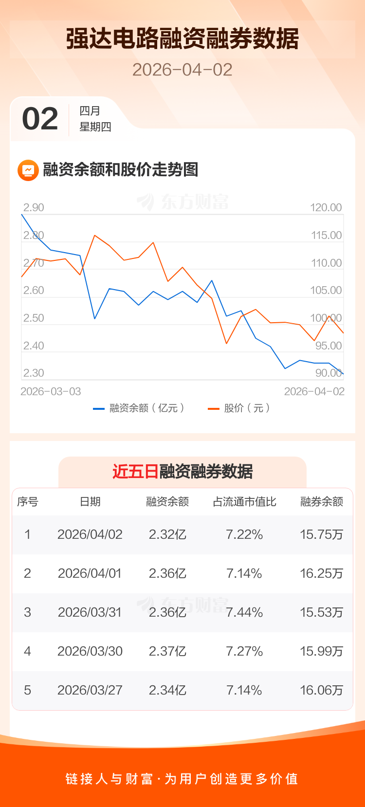交易所最新数据显示,强达电路于2026年4月2日获融资买入1139.31万元,融资偿还1611.70万元,当日融资净偿还472.4万元。目前,该股融资余额2.32亿,占流通市值比例为7.22%。