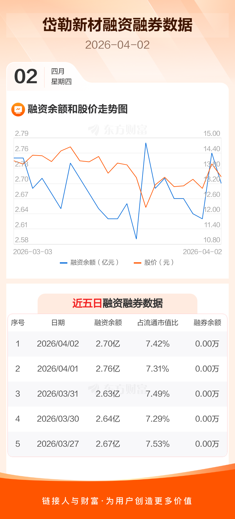 交易所最新数据显示,岱勒新材于2026年4月2日获融资买入1012.09万元,融资偿还1623.97万元,当日融资净偿还611.88万元。目前,该股融资余额2.70亿,占流通市值比例为7.42%。