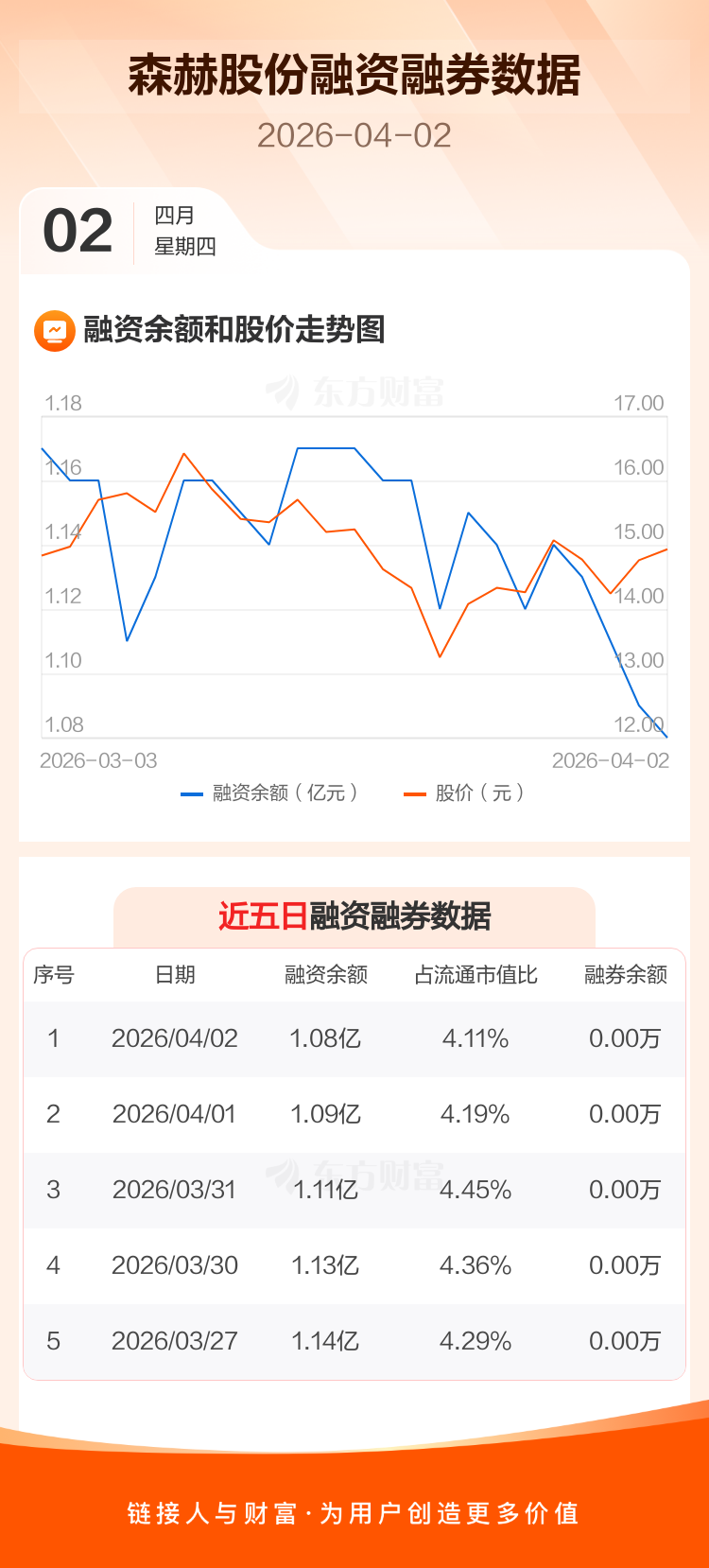 交易所最新数据显示,森赫股份于2026年4月2日获融资买入622.04万元,融资偿还700.16万元,当日融资净偿还78.11万元。目前,该股融资余额1.08亿,占流通市值比例为4.11%。