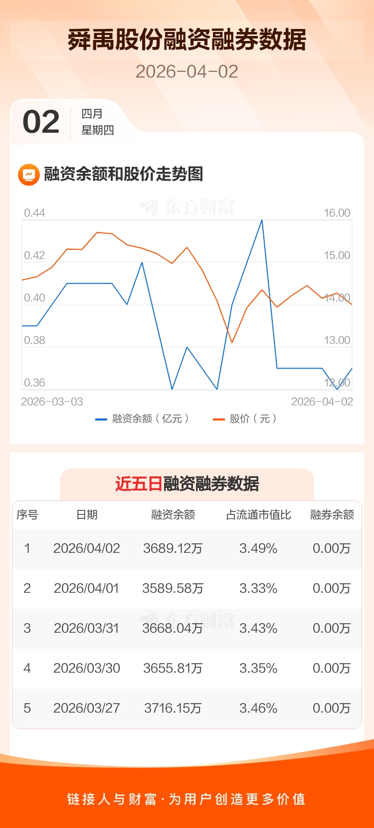 交易所最新数据显示,舜禹股份于2026年4月2日获融资买入331.00万元,融资偿还231.46万元,当日融资净买入99.54万元。目前,该股融资余额3689.12万,占流通市值比例为3.49%。