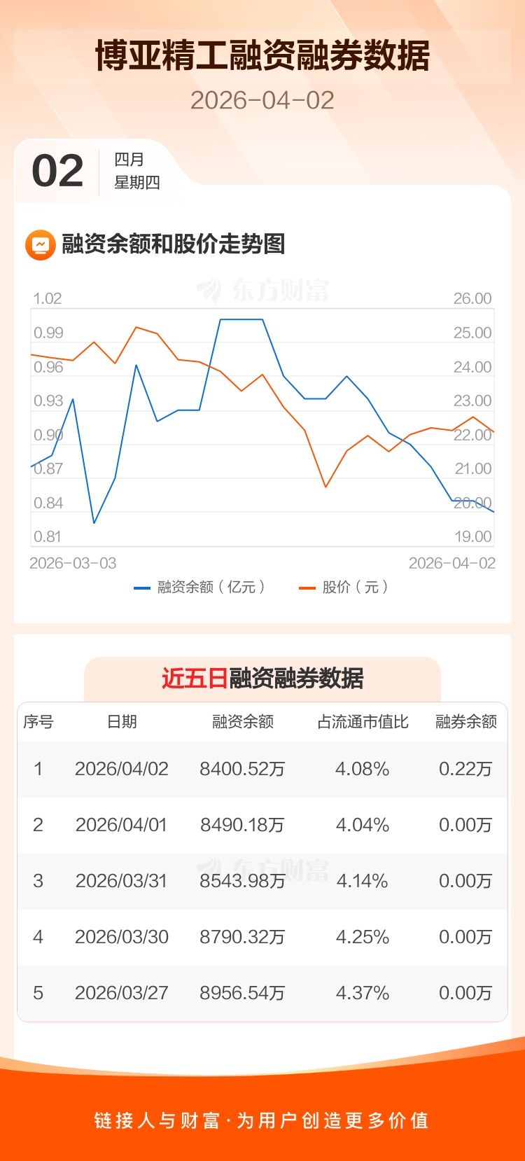交易所最新数据显示,博亚精工于2026年4月2日获融资买入556.14万元,融资偿还645.80万元,当日融资净偿还89.66万元。目前,该股融资余额8400.52万,占流通市值比例为4.08%。