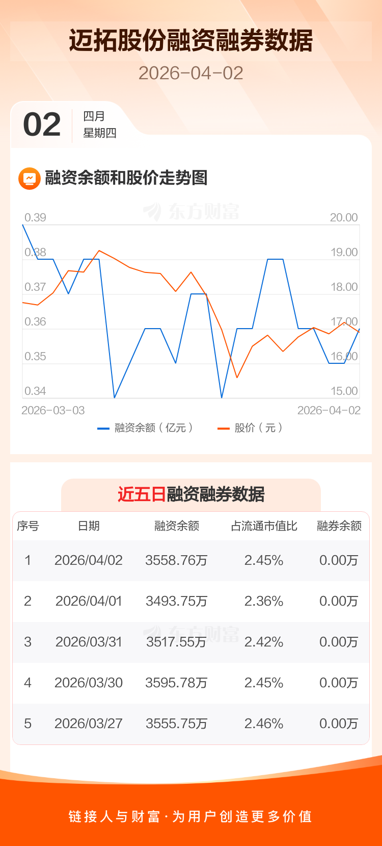 交易所最新数据显示,迈拓股份于2026年4月2日获融资买入400.53万元,融资偿还335.52万元,当日融资净买入65.01万元。目前,该股融资余额3558.76万,占流通市值比例为2.45%。