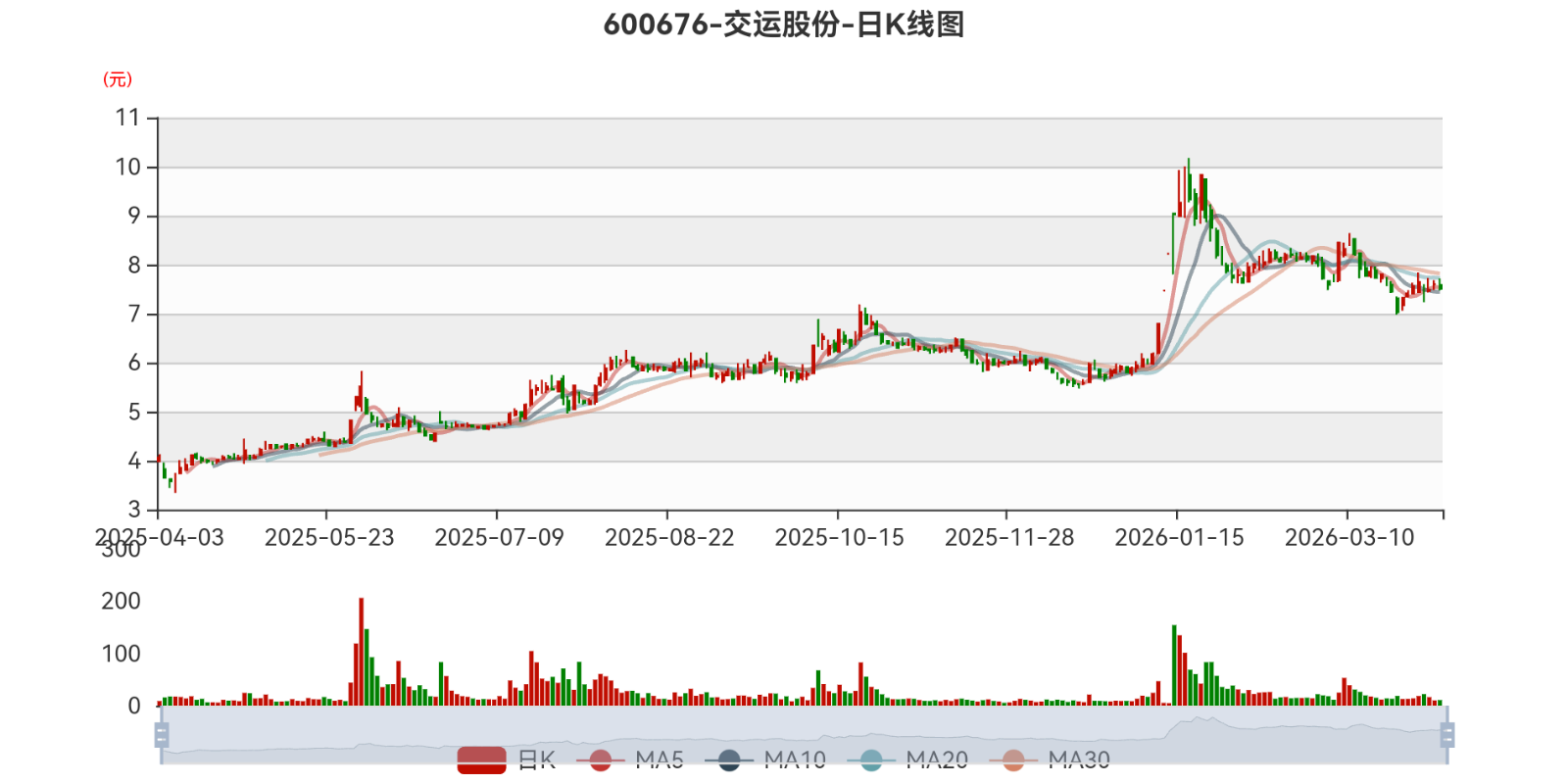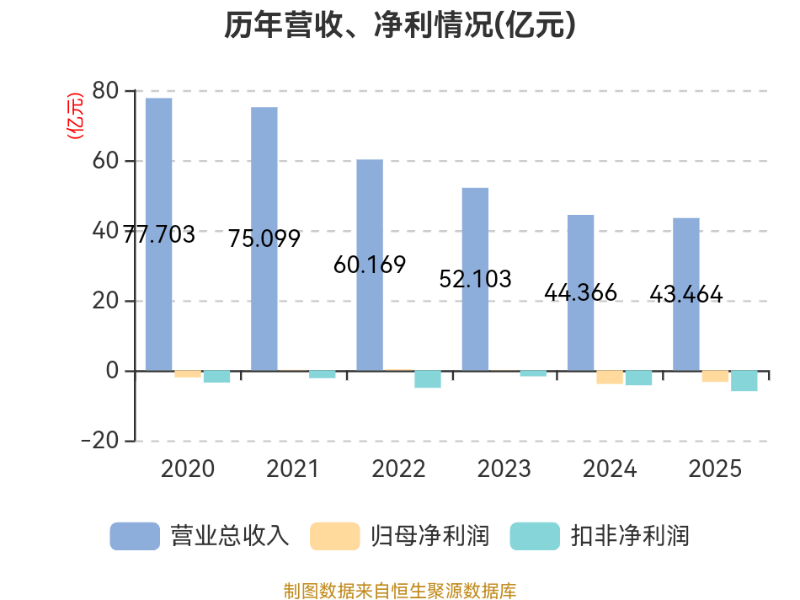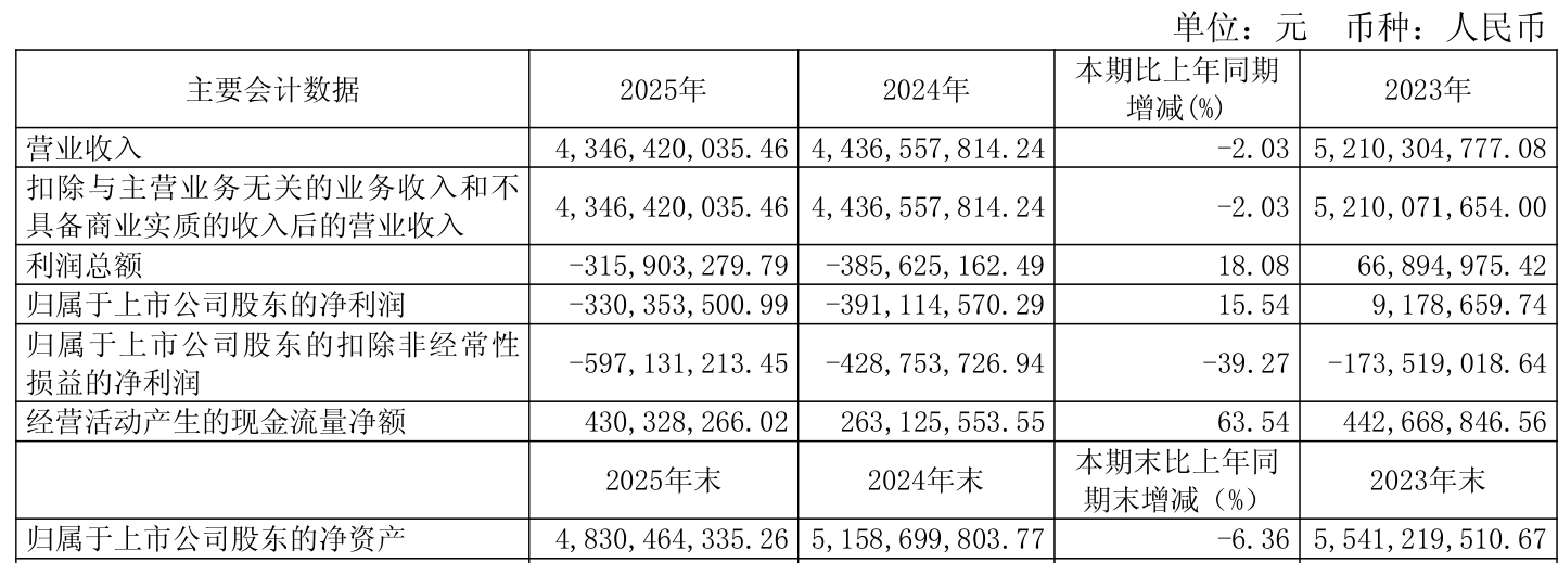 中证智能财讯交运股份(600676)4月3日披露2025年年度报告。2025年,公司实现营业总收入43.46亿元,同比下降2.03%;归母净利润亏损3.3亿元,上年同期亏损3.91亿元;扣非净利润亏损5.97亿元,上年同期亏损4.29亿元;经营活动产生的现金流量净额为4.3亿元,同比增长63.54%;报告期内,交运股份基本每股收益为-0.32元,加权平均净资产收益率为-6.61%。