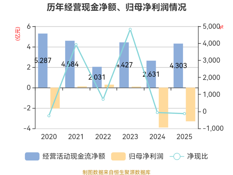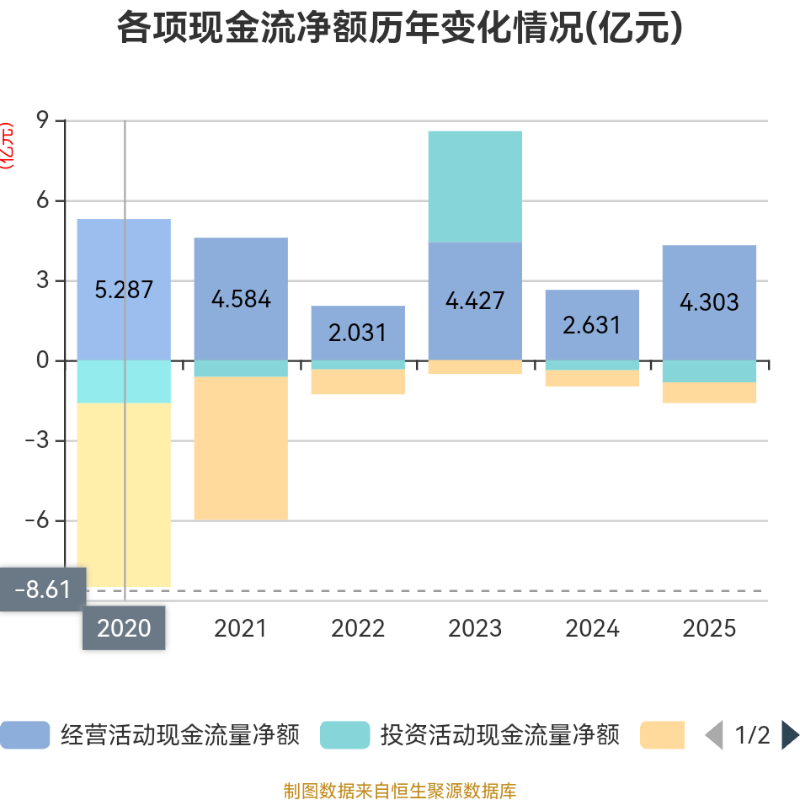 截至2025年,公司经营活动现金流净额为4.3亿元,同比增长63.54%;筹资活动现金流净额-7782.35万元,同比减少1712.96万元;投资活动现金流净额-8373.22万元,上年同期为-3839.69万元。