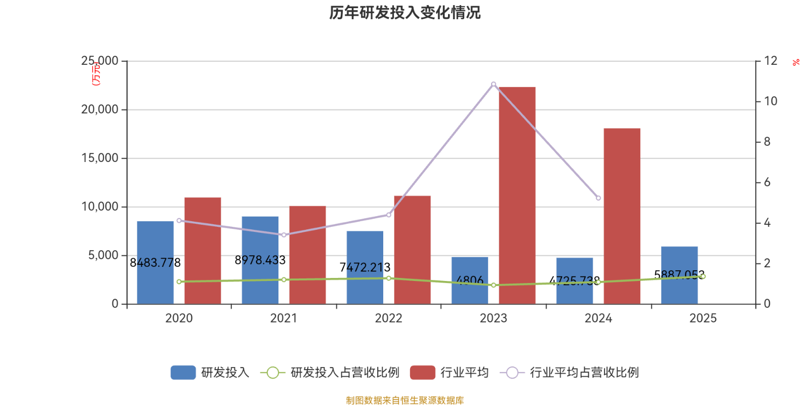 2025年全年,公司研发投入金额为5887.05万元,同比增长24.57%;研发投入占营业收入比例为1.35%,相比上年同期上升0.28个百分点。此外,公司全年研发投入资本化率为0%。