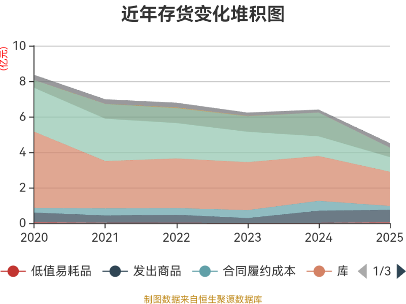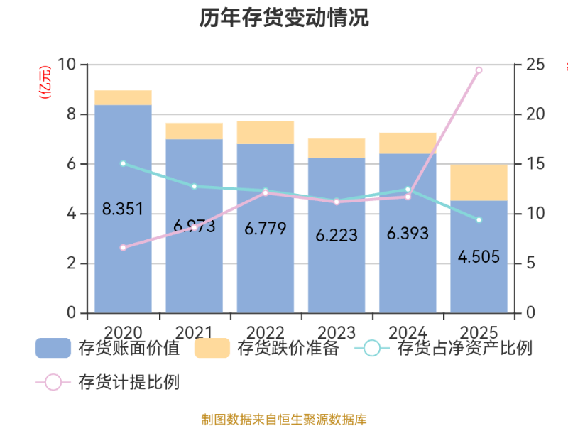 从存货变动来看,截至2025年末,公司存货账面价值为4.5亿元,占净资产的9.33%,较上年末减少1.89亿元。其中,存货跌价准备为1.45亿元,计提比例为24.38%。
