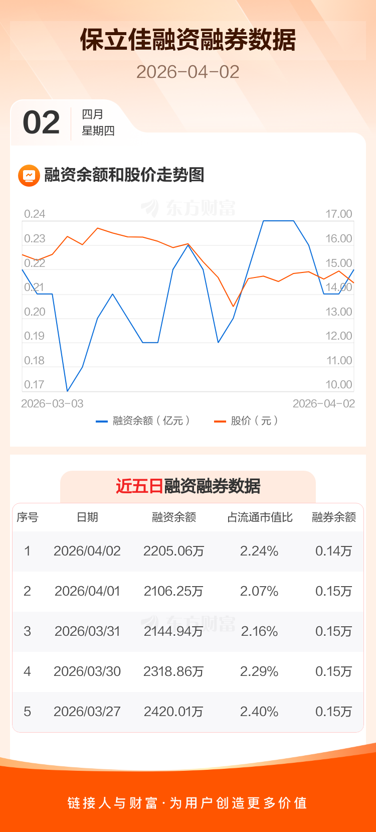 交易所最新数据显示,保立佳于2026年4月2日获融资买入358.21万元,融资偿还259.41万元,当日融资净买入98.8万元。目前,该股融资余额2205.06万,占流通市值比例为2.24%。