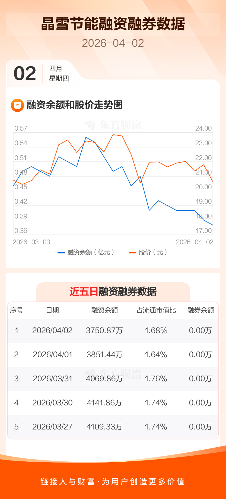 交易所最新数据显示,晶雪节能于2026年4月2日获融资买入362.13万元,融资偿还462.70万元,当日融资净偿还100.57万元。目前,该股融资余额3750.87万,占流通市值比例为1.68%。