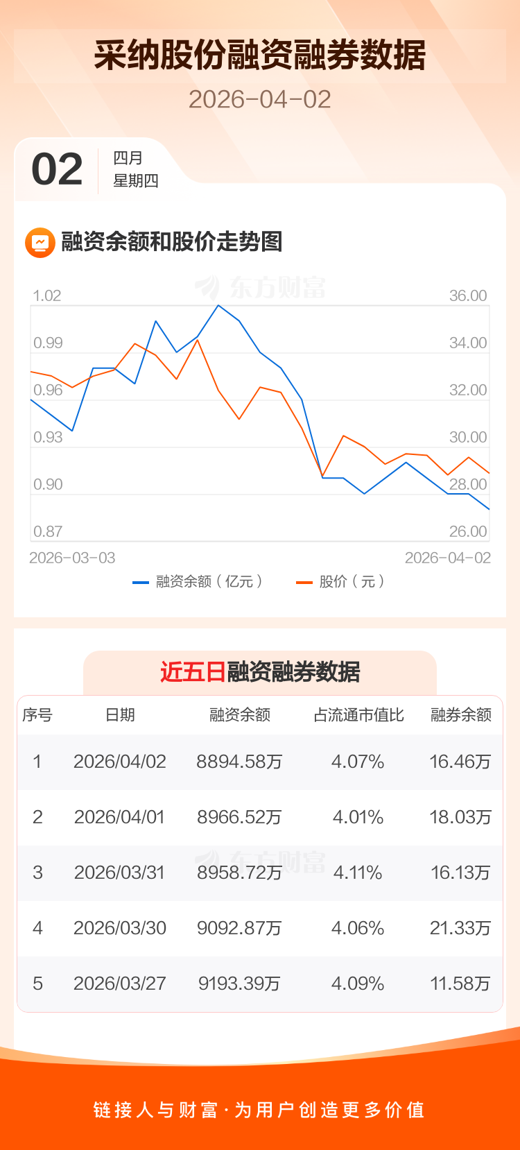 交易所最新数据显示,采纳股份于2026年4月2日获融资买入234.37万元,融资偿还306.31万元,当日融资净偿还71.94万元。目前,该股融资余额8894.58万,占流通市值比例为4.07%。