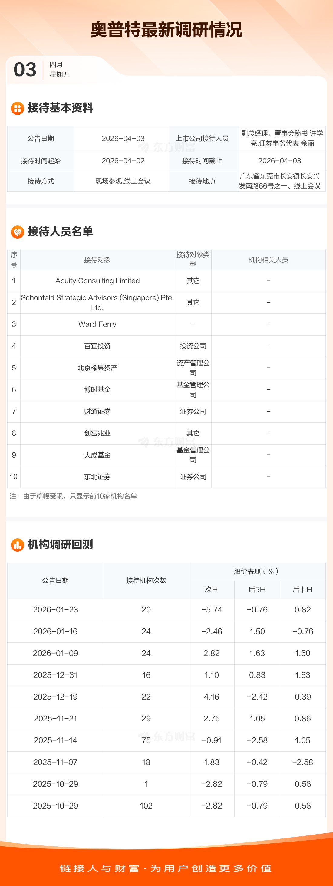 奥普特4月3日公告称,4月2日至4月3日接待Acuity Consulting Limited等96家机构调研。接待人员包括副总经理、董事会秘书 许学亮,证券事务代表 余丽。