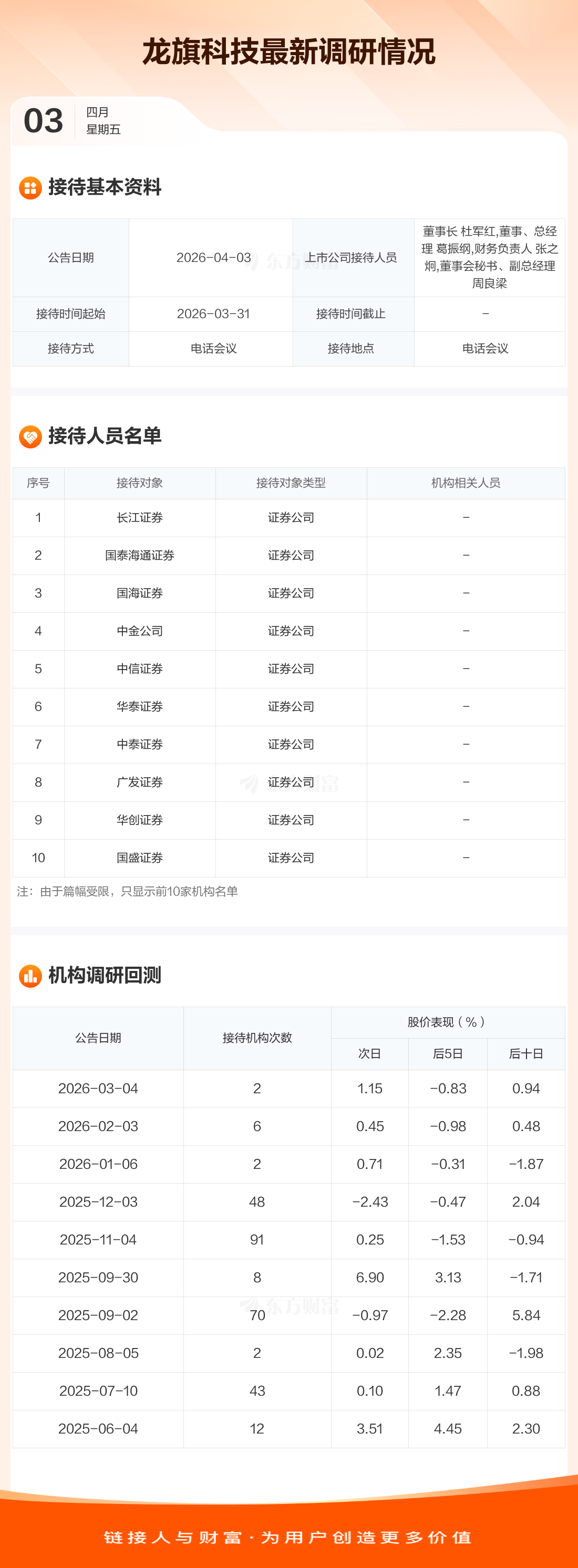 龙旗科技4月3日公告称,3月31日接待长江证券等78家机构调研。接待人员包括董事长 杜军红,董事、总经理 葛振纲,财务负责人 张之炯,董事会秘书、副总经理 周良梁。