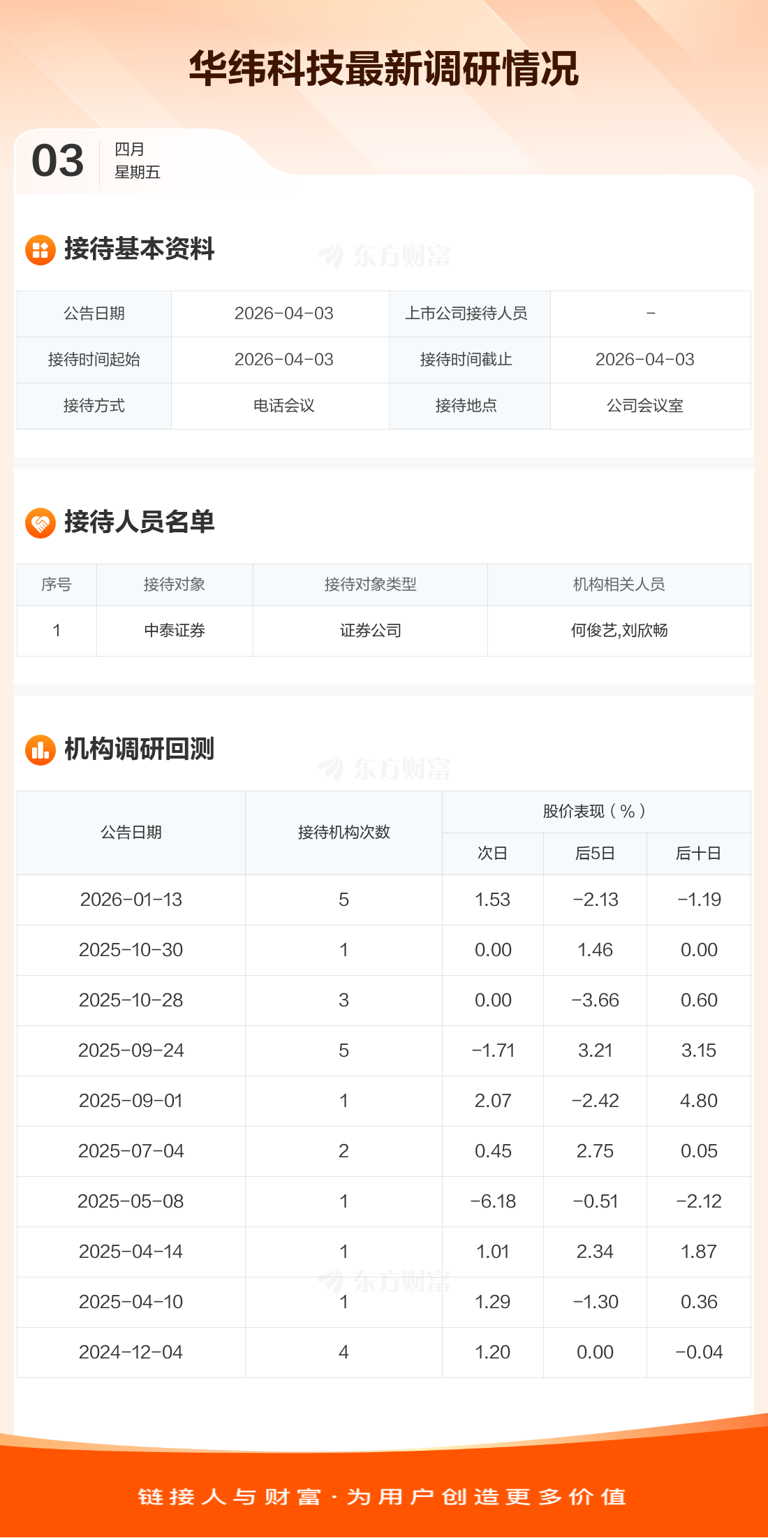 华纬科技4月3日公告称,4月3日接待中泰证券等1家机构调研。