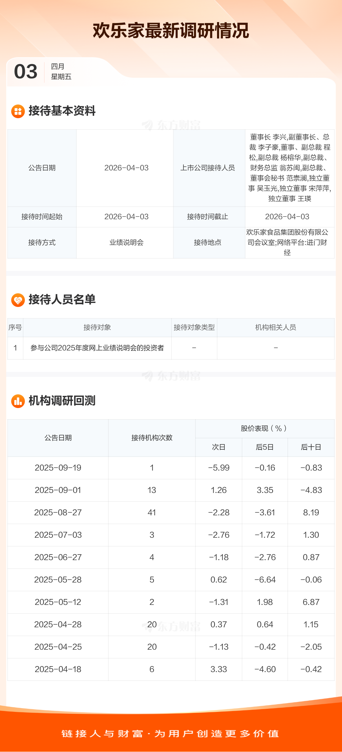 欢乐家4月3日公告称,4月3日接待参与公司2025年度网上业绩说明会的投资者等1家机构调研。接待人员包括董事长 李兴,副董事长、总裁 李子豪,董事、副总裁 程松,副总裁 杨榕华,副总裁、财务总监 翁苏闽,副总裁、董事会秘书 范崇澜,独立董事 吴玉光,独立董事 宋萍萍,独立董事 王瑛。
