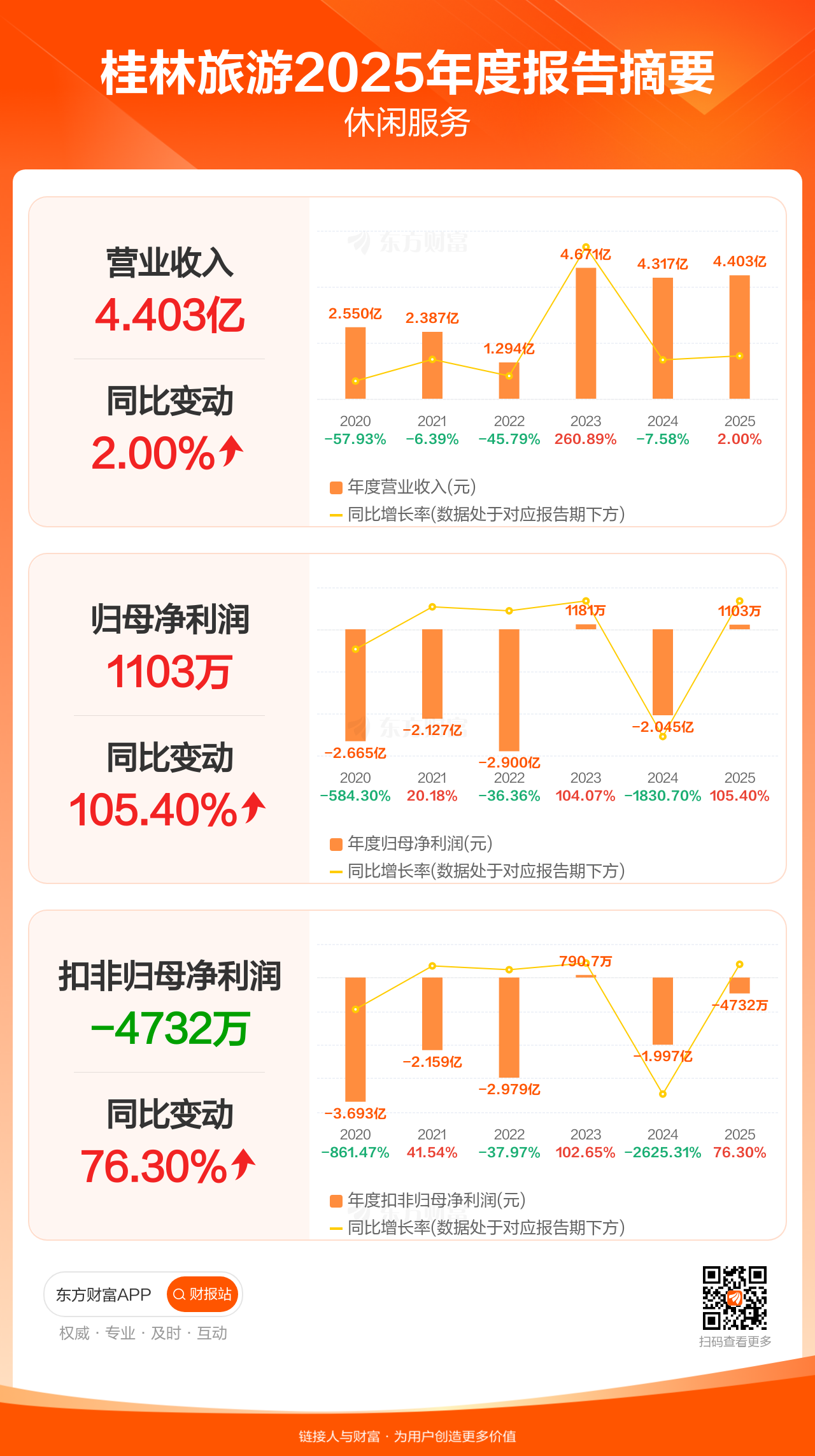 桂林旅游4月4日发布2025年年报显示,公司全年实现营业收入4.40亿元,同比增长2.00%;归母净利润1103.28万元,同比增长105.40%;扣非归母净利润-4731.98万元。