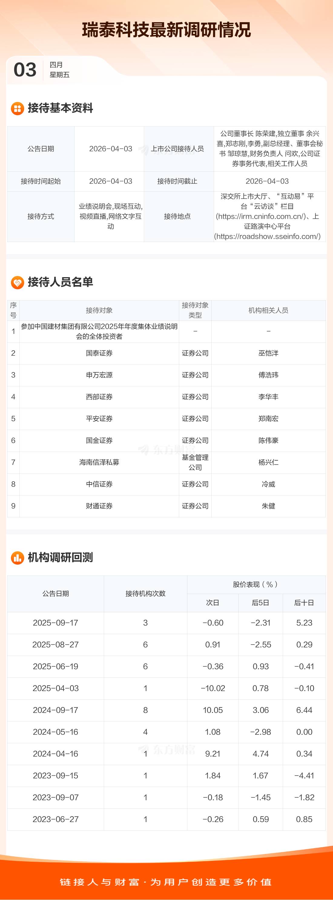 瑞泰科技4月3日公告称,4月3日接待参加中国建材集团有限公司2025年年度集体业绩说明会的全体投资者等9家机构调研。接待人员包括公司董事长 陈荣建,独立董事 余兴喜,郑志刚,李勇,副总经理、董事会秘书 邹琼慧,财务负责人 问欢,公司证券事务代表,相关工作人员。