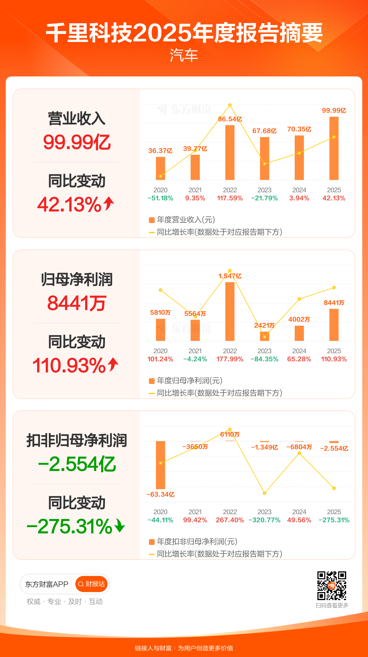 千里科技4月4日发布2025年年报显示,公司全年实现营业收入99.99亿元,同比增长42.13%;归母净利润8440.82万元,同比增长110.93%;扣非归母净利润-2.55亿元。