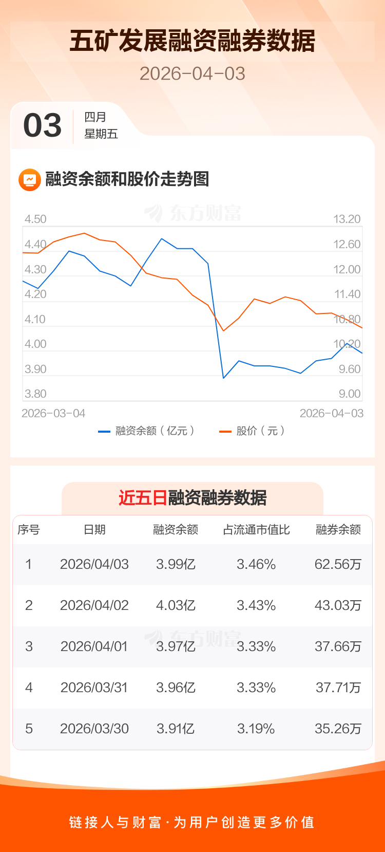 交易所最新数据显示,五矿发展于2026年4月3日获融资买入954.56万元,融资偿还1358.26万元,当日融资净偿还403.69万元。目前,该股融资余额3.99亿,占流通市值比例为3.46%。