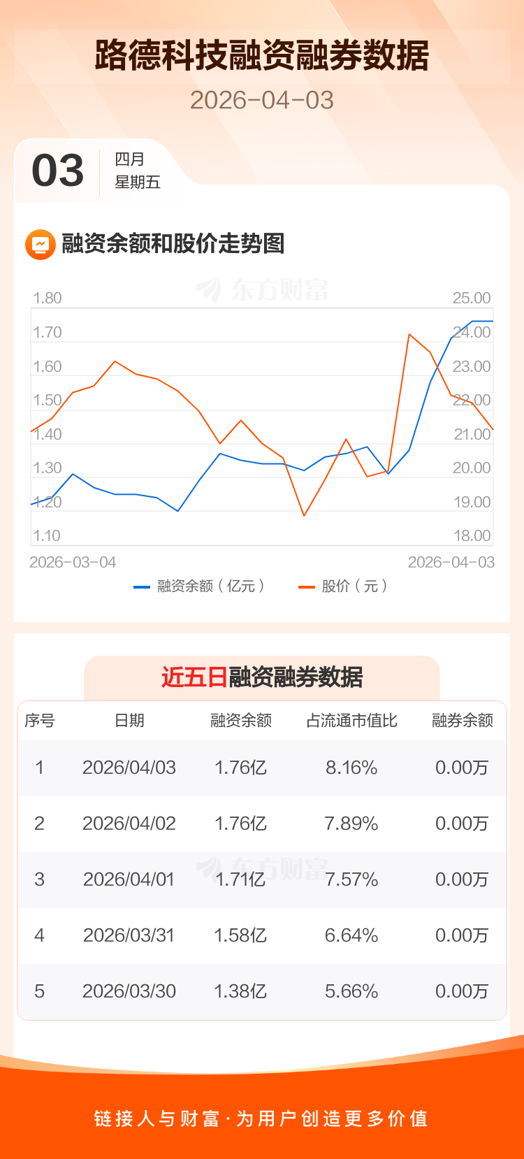 交易所最新数据显示,路德科技于2026年4月3日获融资买入381.76万元,融资偿还420.37万元,当日融资净偿还38.6万元。目前,该股融资余额1.76亿,占流通市值比例为8.16%。