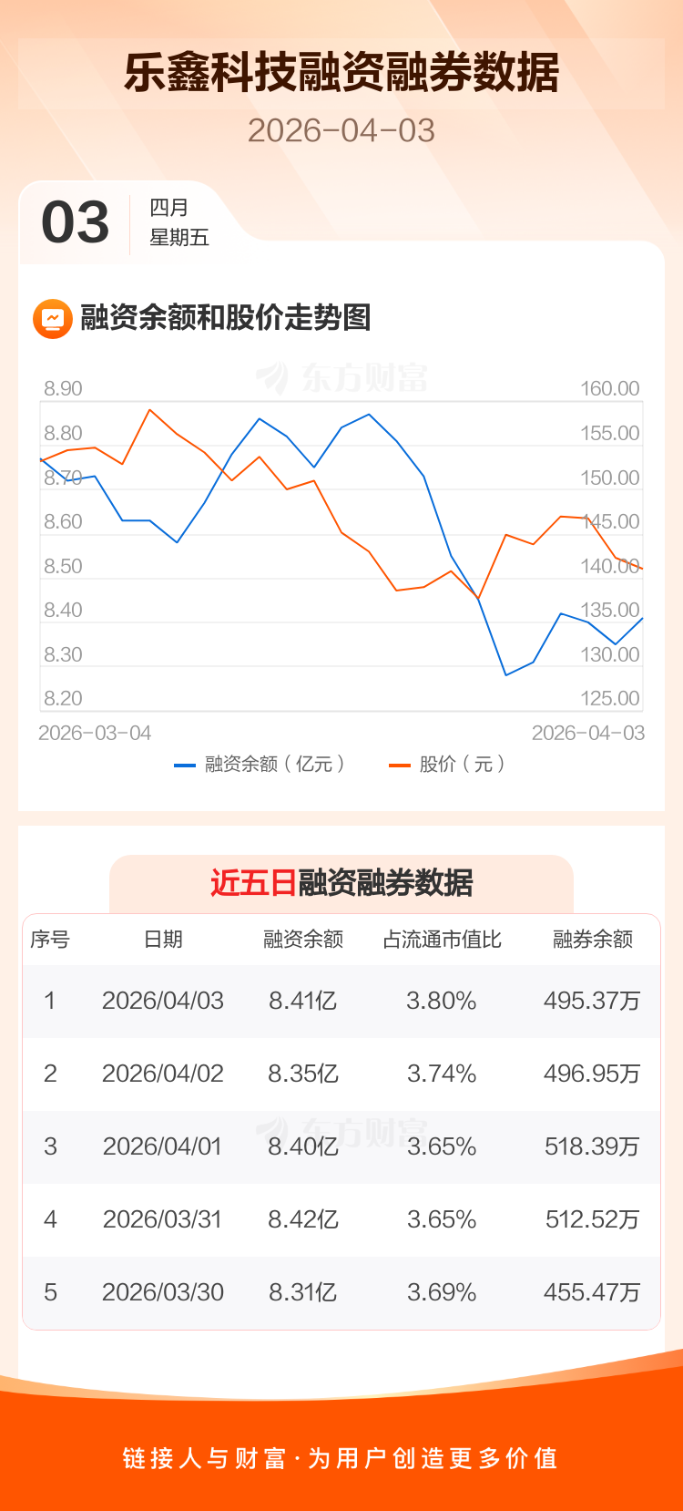 交易所最新数据显示,乐鑫科技于2026年4月3日获融资买入2560.89万元,融资偿还1976.36万元,当日融资净买入584.53万元。目前,该股融资余额8.41亿,占流通市值比例为3.80%。