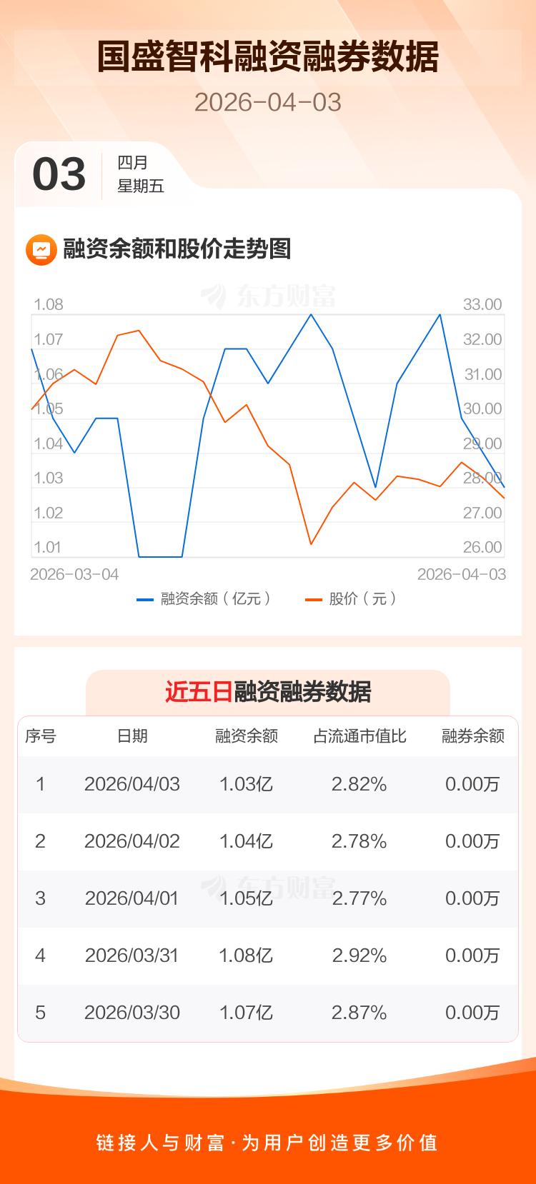 交易所最新数据显示,国盛智科于2026年4月3日获融资买入174.72万元,融资偿还250.95万元,当日融资净偿还76.23万元。目前,该股融资余额1.03亿,占流通市值比例为2.82%。