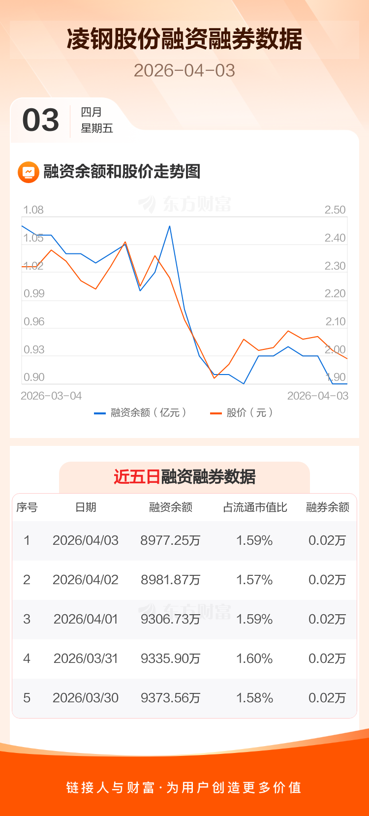 交易所最新数据显示,凌钢股份于2026年4月3日获融资买入116.24万元,融资偿还120.87万元,当日融资净偿还4.63万元。目前,该股融资余额8977.25万,占流通市值比例为1.59%。