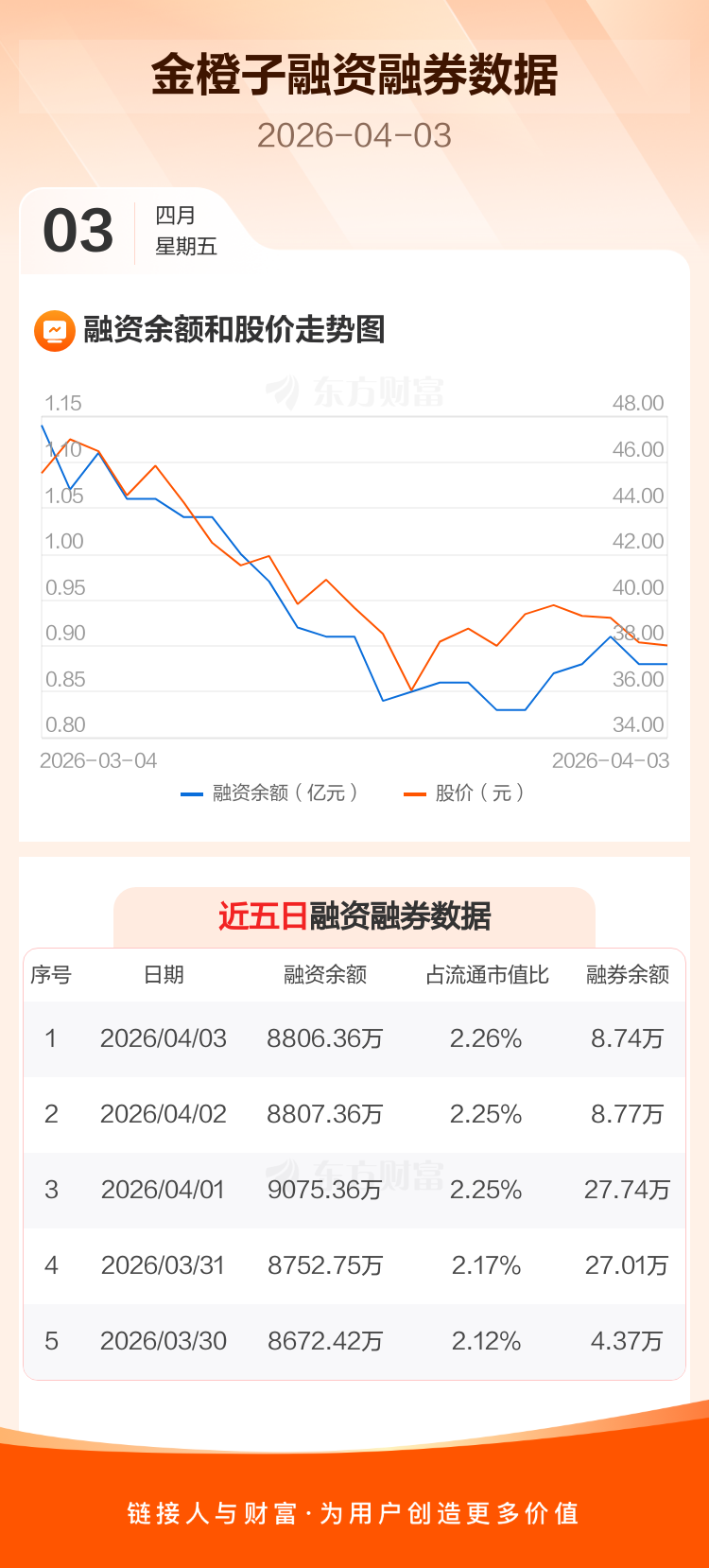 交易所最新数据显示,金橙子于2026年4月3日获融资买入818.50万元,融资偿还819.50万元,当日融资净偿还9994元。目前,该股融资余额8806.36万,占流通市值比例为2.26%。