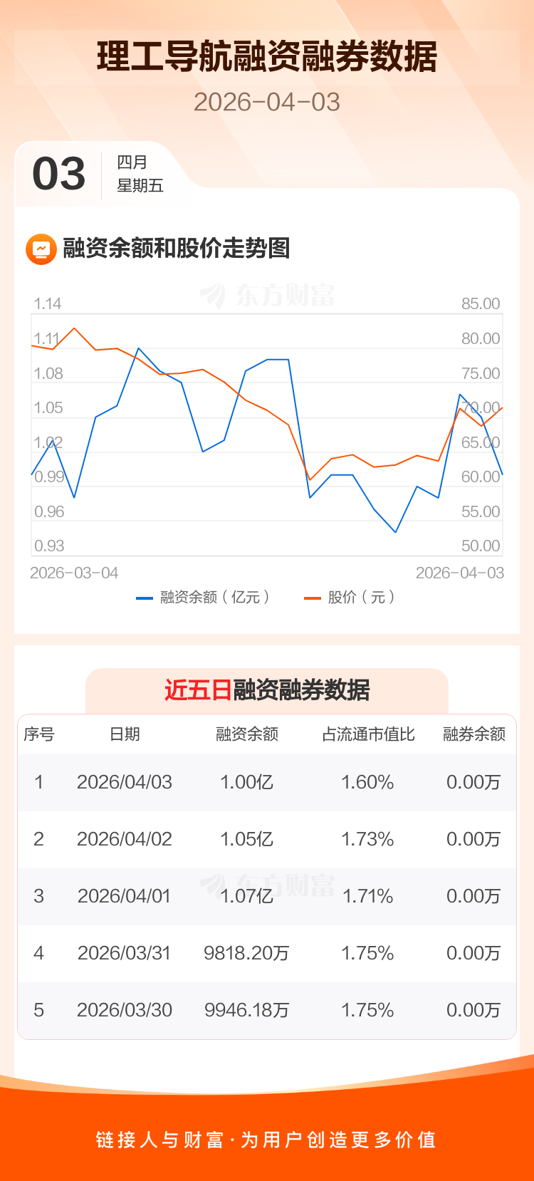 交易所最新数据显示,理工导航于2026年4月3日获融资买入943.87万元,融资偿还1395.12万元,当日融资净偿还451.25万元。目前,该股融资余额1.00亿,占流通市值比例为1.60%。