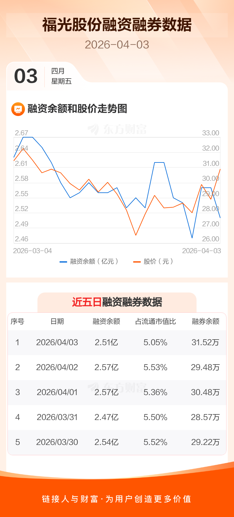 交易所最新数据显示,福光股份于2026年4月3日获融资买入1923.74万元,融资偿还2527.81万元,当日融资净偿还604.07万元。目前,该股融资余额2.51亿,占流通市值比例为5.05%。