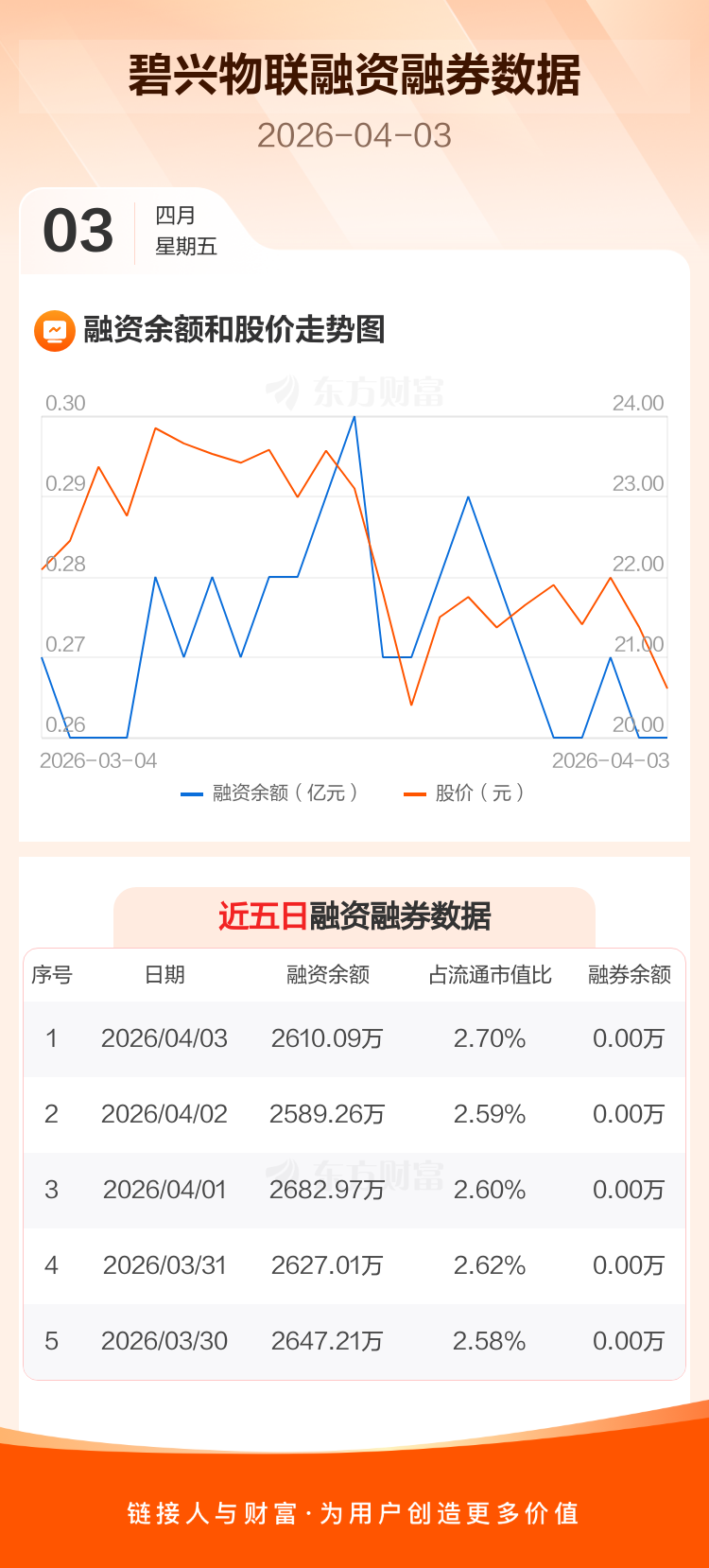 交易所最新数据显示,碧兴物联于2026年4月3日获融资买入164.74万元,融资偿还143.92万元,当日融资净买入20.82万元。目前,该股融资余额2610.09万,占流通市值比例为2.70%。