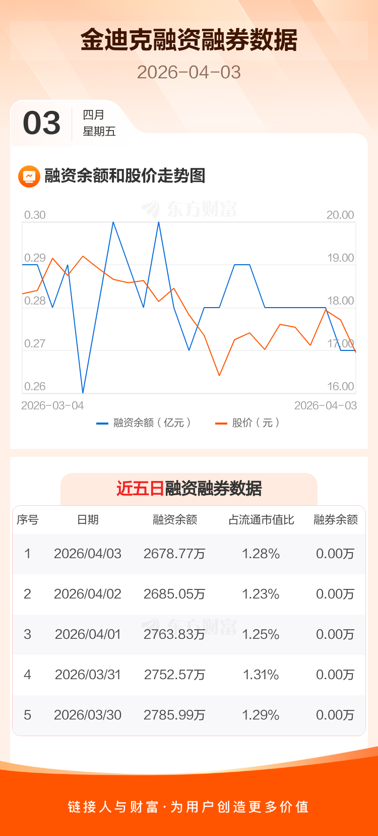 交易所最新数据显示,金迪克于2026年4月3日获融资买入225.39万元,融资偿还231.68万元,当日融资净偿还6.29万元。目前,该股融资余额2678.77万,占流通市值比例为1.28%。