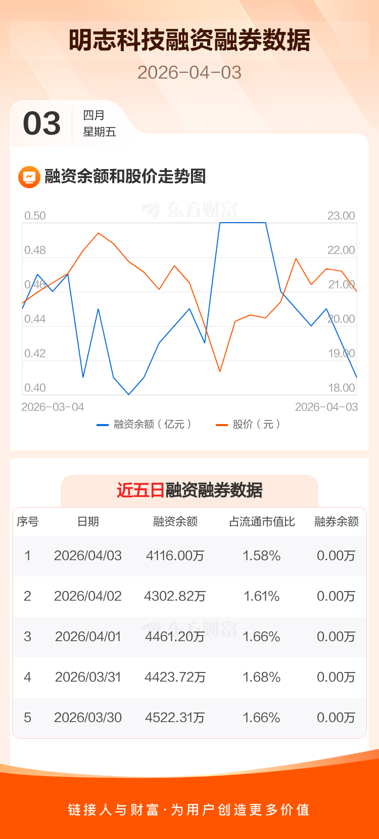 交易所最新数据显示,明志科技于2026年4月3日获融资买入378.50万元,融资偿还565.32万元,当日融资净偿还186.82万元。目前,该股融资余额4116.00万,占流通市值比例为1.58%。