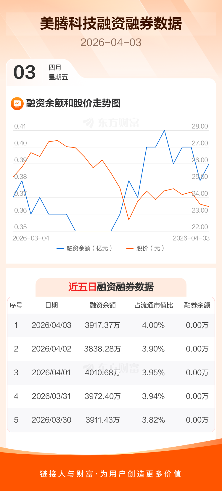 交易所最新数据显示,美腾科技于2026年4月3日获融资买入206.78万元,融资偿还127.70万元,当日融资净买入79.09万元。目前,该股融资余额3917.37万,占流通市值比例为4.00%。