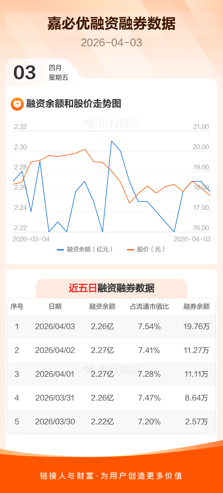 交易所最新数据显示,嘉必优于2026年4月3日获融资买入307.28万元,融资偿还408.35万元,当日融资净偿还101.07万元。目前,该股融资余额2.26亿,占流通市值比例为7.54%。