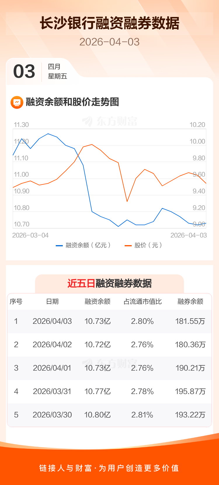交易所最新数据显示,长沙银行于2026年4月3日获融资买入760.91万元,融资偿还662.50万元,当日融资净买入98.41万元。目前,该股融资余额10.73亿,占流通市值比例为2.80%。
